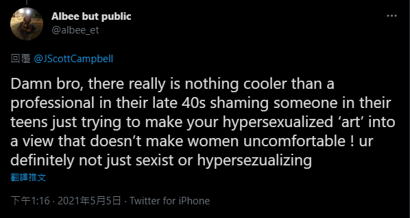 ▼也有網友痛批J. Scott Campbell作為一個成年繪師,這種對一個年輕孩子擺出架子,做出「反指正」的羞辱行為相當不可取,並且指控Campbell根本就是歧視、物化女性的人