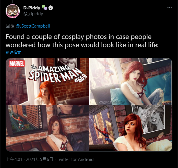 ▼有趣的是,也有人將過去將《Amazing Spider-Man》#601 進行Cosplay的Coser的照片亮出,藉此證明J. Scott Campbell原先繪製的封面,並沒有所謂的不自然感