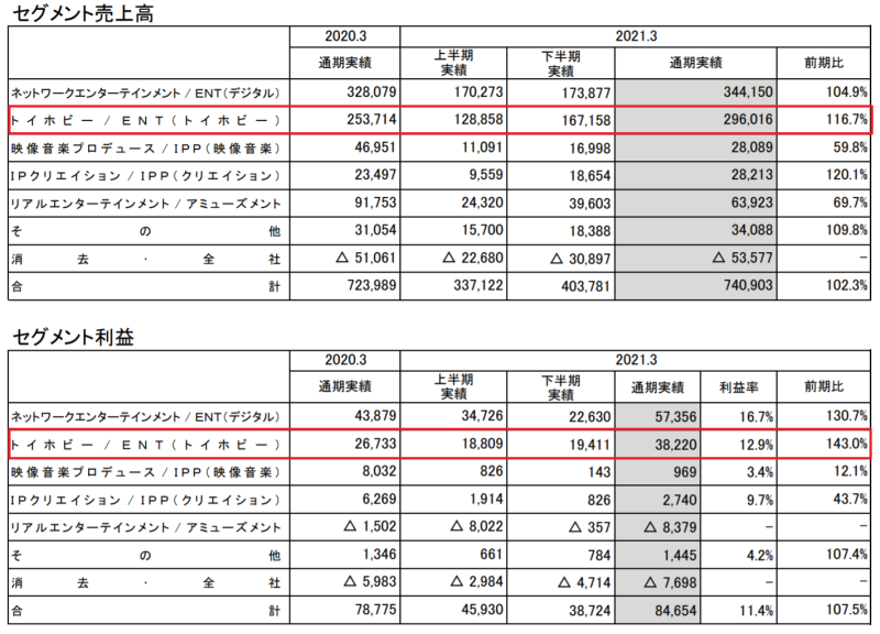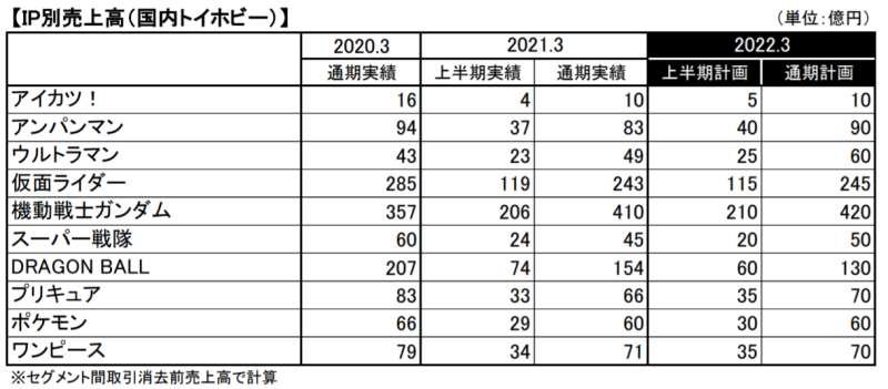 財報中指出日本國內雖受肺炎疫情影響實體通路的販售,不過 BANDAI SPIRITS 推出的鋼普拉組裝模型、TAMASHII NATIONS 品牌高階收藏玩具等《機動戰士鋼彈》系列商品,仍藉由活用電商平台、數位行銷等策略獲得不錯的成績。而《假面騎士》系列的收益主要來自使用既有 IP 與新 IP 製作的玩具、糖果等商品。日本國外雖有地區也受到肺炎疫情影響實體通路,但高階收藏玩具商品的收益在以亞洲為中心的地區仍有穩定成長。