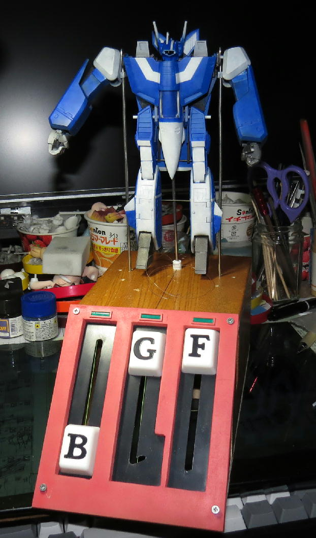 作者為すーめだか(@smdk30),他為動畫中最著名的機體「VF-1女武神」做了個「自動變形裝置」,雖然上面有BGF三個鍵,但僅靠一個控制鍵就能控制型態變化,只要將女武神架在裝置上,並滑動G控制鍵就能做到不用手來進行變形。