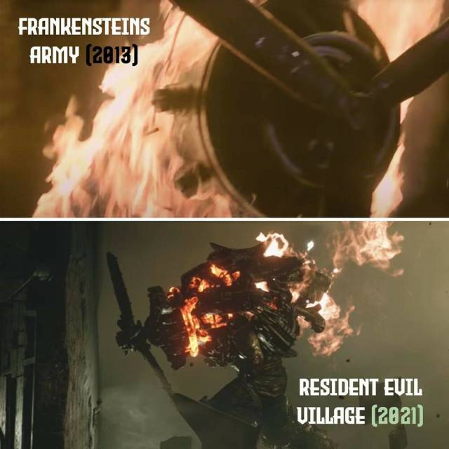 從對比圖中我們可以看到,電影《弗蘭肯斯坦的軍隊》中的怪物,都確實與《惡靈古堡8》的疾風造型十分相似,分別都有著極具代表性的螺旋槳設計,甚至連燃燒、爆炸的特效也都有所雷同,也因拉佛斯特導演的爆料後,引起不少玩家的注意。