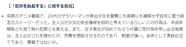 「在深夜動畫中,20來歲的上班族遇到一位離家出走的女孩,沒有跟警察,也沒有跟女孩的雙親聯絡,反而是將女孩收容在自己家裡。這個行為看似是在確保她的安全,但也可以解讀誘拐成未成年人。」投訴還說,這部動畫還出現女高中生說要以身體換宿的情節。雖然主角有制止,但這情節已經使人聯想到賣春,刺激太強了。最後投訴者表示:「故事整體塑造成一樁美談,但其實是有害的不是嗎?」