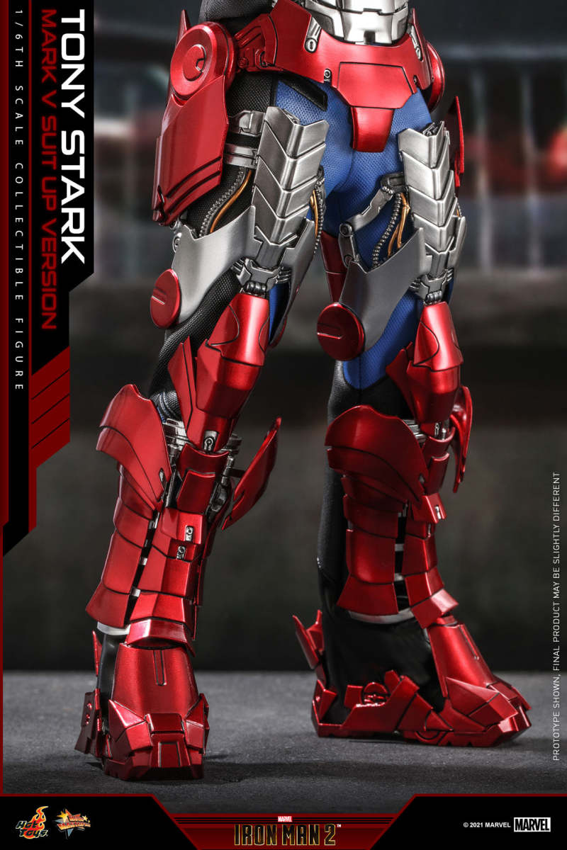在《鋼鐵人2》中,東尼一行人在蒙地卡羅歷史方程式賽車賽道被「鞭狂」伊凡·萬科襲擊、東尼緊急藉著搭載變形功能的馬克5 裝甲,從手提箱狀態著裝的場面相信是最經典的橋段之一!這次 Hot Toys 就是要推出還原這一時刻的作品,本作能夠讓玩具人把玩出東尼身穿「賽車服」與「馬克5 著裝中」兩種造型,賽車服部分重現了藍黑主調的搭配與「STARK」字樣,銀紅配色的鋼鐵裝則是以多個配件的方式來安裝,除了一貫的厚重金屬感塗裝、胸口反應爐發光功能之外,外露的機械內構、電線,以及各部件的延展狀態絕對也讓人大呼過癮!藉著裝甲的部分可動與自由拆裝,就能展現出著裝狀態不同的造型。