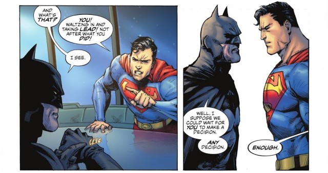 但甚至在知道任務是什麼之前,超人與蝙蝠俠這對「前任」世界最佳搭檔差一點一見面就直接大打出手!超人認為蝙蝠俠沒有資格再擔任領導者,顯然他之前曾經犯了大錯;但是蝙蝠俠馬上回嘴,要是你有做出任何決策就好了。兩人都氣勢逼人,誰也不肯退讓,最後還是神力女超人出手阻止。
