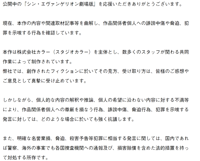 《新·福音戰士劇場版:│▌》在日本上映後,雖說票房一路飆升,但是仍有粉絲對於該作的劇情不滿,甚至化為行動,針對作品工作人員進行騷擾、恐嚇與誹謗等行為,這樣的行為已經造成人員的不安,官方屆時只能跳出來對於行為嚴厲譴責,希望社會上這種不良現象可以停止,並保留法律行為。