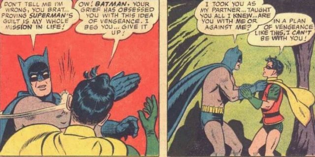 「Batman Slapping Robin Meme」出自於1965年《World's Finest Comics》#153當中,講述著「倘若蝙蝠俠想殺死超人」的一個假設、非正史的故事。在這個宇宙當中,布魯斯韋恩的父親並不是死在高譚,而是在斯莫維爾中遭到有著超能力的神秘人士所殺害。也因此超人便成了布魯斯最大的嫌疑犯,為了尋求復仇,布魯斯裝扮蝙蝠俠來增加接近超人的機會。