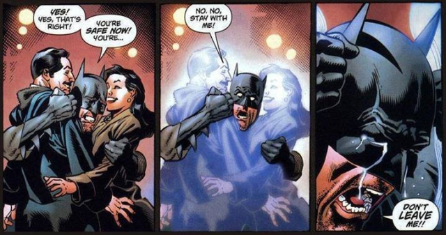 看見且聽見早已逝世的父母出現在自己面前的布魯斯,上前大力擁抱著雙親,但由於始終是幻想,下一秒韋恩夫婦便消失在蝙蝠俠的面前,同時蝙蝠俠也在喪痛之中恢復了理智,重新思考了自己成為超級英雄的初衷。