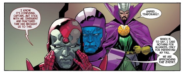 ▼出自《Avengers》Vol.5 #34,鋼鐵小子(Iron Lad)、征服者康(Kang the Conqueror)、永生者(Immortus)等三個時間點的Nathaniel Richards在時間盡頭齊聚一堂,暫時與自己結盟