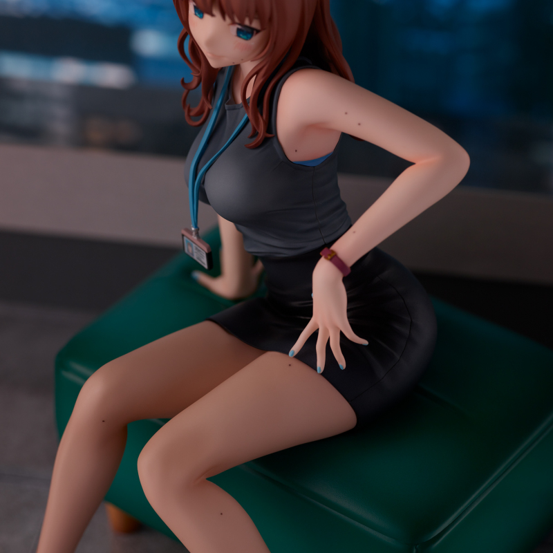 UNIONCREATIVE「很多痣的前輩 OL」PVC塗裝完成品,將繪師どうしま筆下的性感插畫立體化,尺寸全高約 230 mm,以坐在質感的綠色沙發上的造型呈現,除了一身貼身背心、窄裙,掛著識別證的辦公室穿搭之外,最吸引人的莫過於在臉上、手臂、腋下和腿部等處的痣啦!前輩扭腰彷彿在展示著自己身體上的痣,性感的姿勢加上撫媚表情相當撩人,實在令人心癢癢忍不住想細數前輩身上的痣呀!