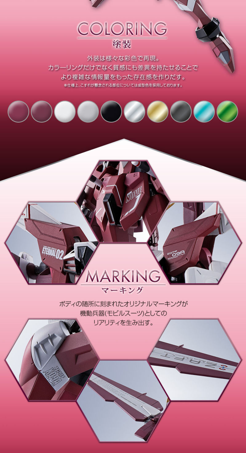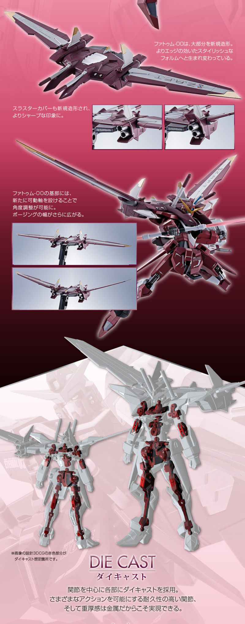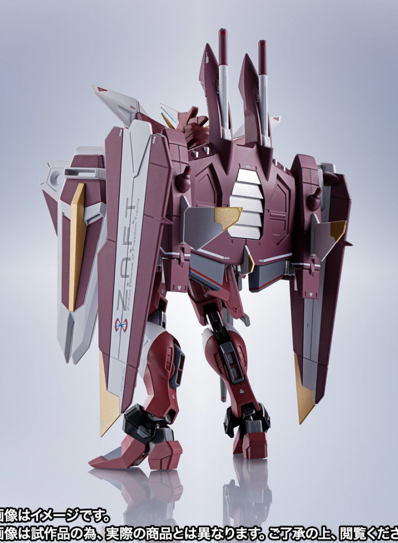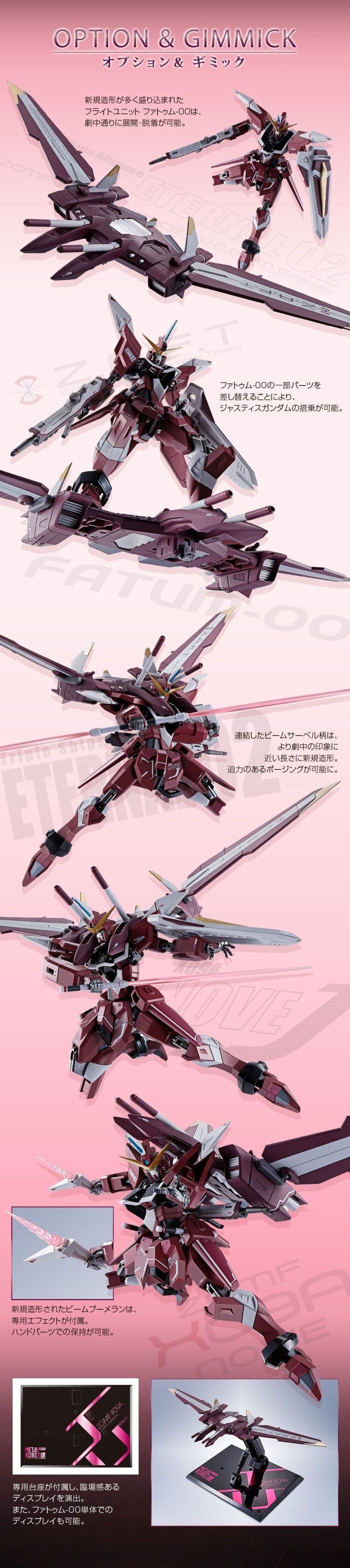 武裝收錄光束步槍、光束軍刀、光束迴旋標、盾牌等,以及背部特徵的無人機「命運-00」。Fatum-00使用更多新規零件重新製作,重現銳利、精悍的造型,同時還追加 ROBOT 魂版本沒有的新可動軸,讓兩側機翼能配合本體調整角度。