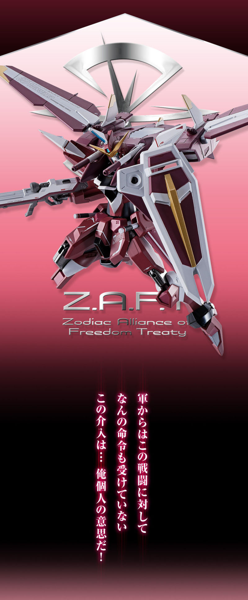 ZGMF-X09A 正義鋼彈是Z.A.F.T.軍將自身技術與 GAT-X 系列 MS 的資料融合,開發出來的次世代 MS,駕駛員為阿斯蘭.薩拉。正義鋼彈和兄弟機自由鋼彈相同搭載了「反中子干擾器」,成功運行核引擎獲得近無限的能源,在PS裝甲與高耗能光束武器並用下也能穩定輸出。正義鋼彈最大的特色就是背部搭載的無人機「Fatum-00」,本身擁有強大的火力,能進行多元的合體.分離戰術。