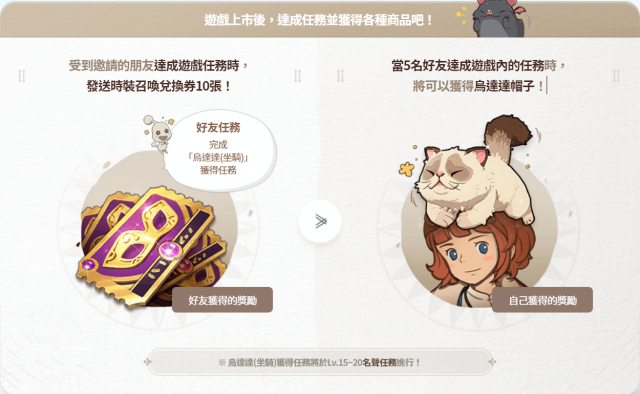 的人能邀請五位朋友,受邀的人在遊戲完成指定任務的話,就能獲得「時裝召喚兌換券」10張,而五位朋友皆有完成指定任務的話,邀請人就能獲得「烏達達的帽子」。
