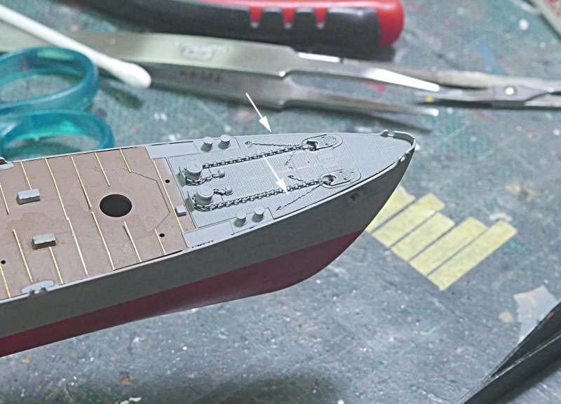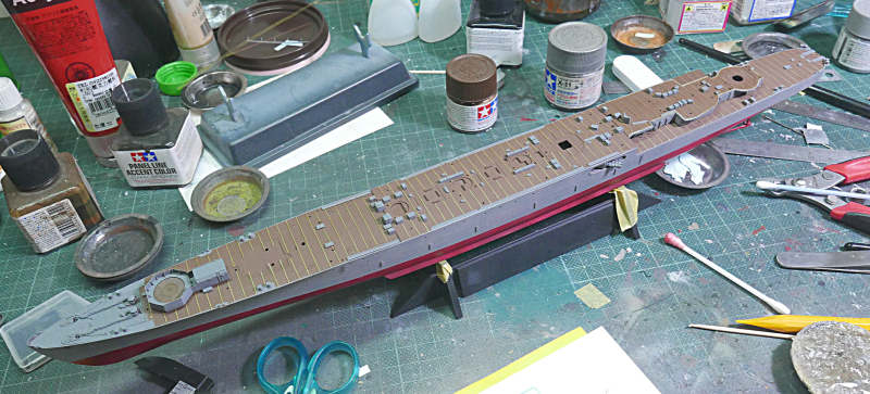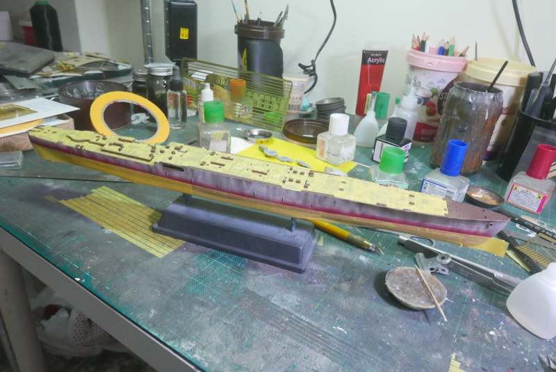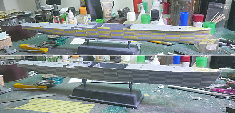 ↑噴完艦體色後拆下遮蓋膠帶,慢慢地貼上甲板的金屬壓條,終於看到完整的艦身樣貌啦。