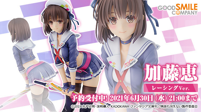 日本模型製造公司「Good Smile Company」(簡稱GSC),將 2019 年「不起眼女主角培育法Fine Racing」插畫立體化,推出獨具魅力的「加藤惠 Racing Ver.」1/7比例模型,參考售價為 13,500 日圓,預計將於 2022 年 02 月發售!
