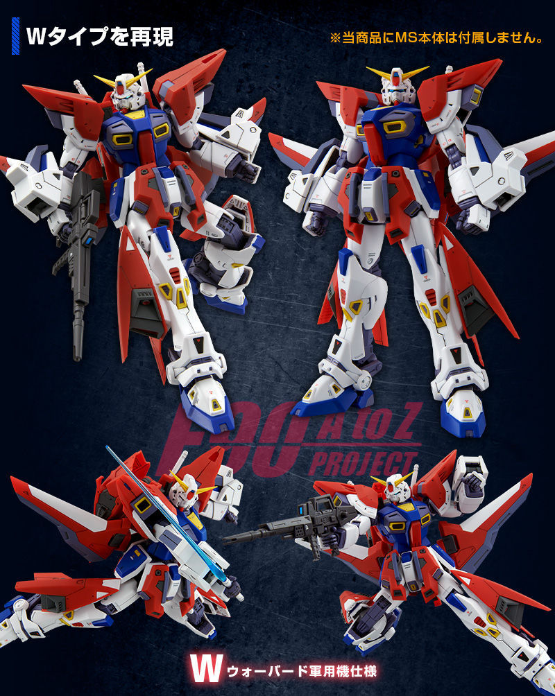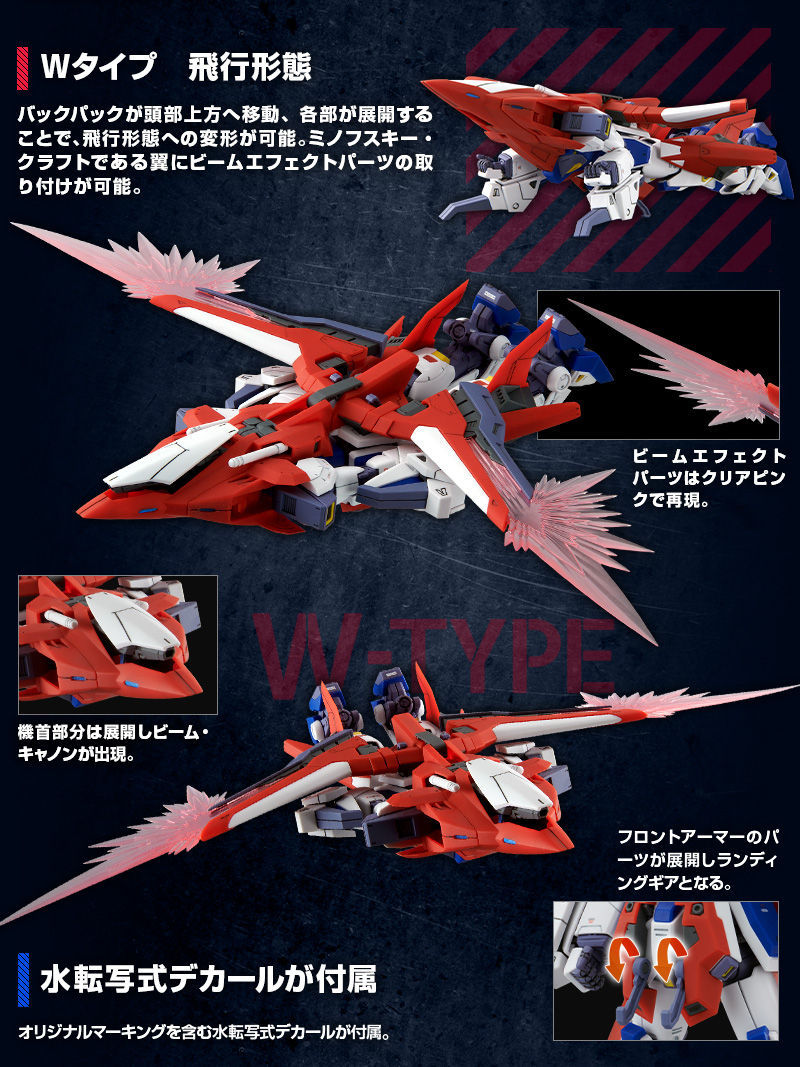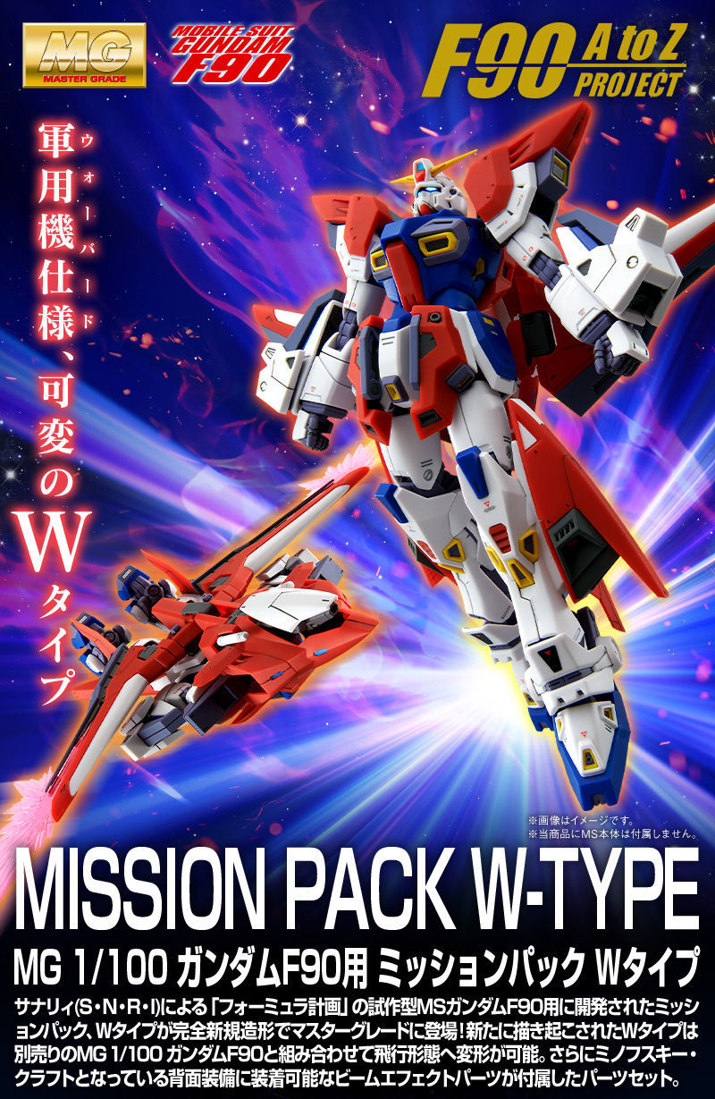 過去沒有設定的W 型任務背包這次由大河原邦男老師進行設計並推出 MG 套件,在鋼彈 F90 全身各處追加鮮紅的飛行裝甲,由於搭載了米諾夫斯基飄浮系統,可讓 F90 變形為在大氣環境內使用的飛行型態「WARBIRD」,機首部份可展開光束加農砲,而配件中也附上從雙翼展開的米諾夫斯基粒子特效。
