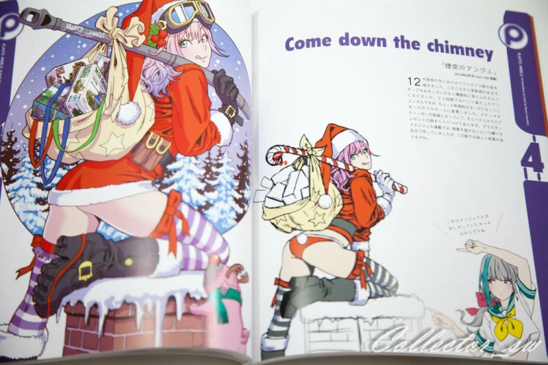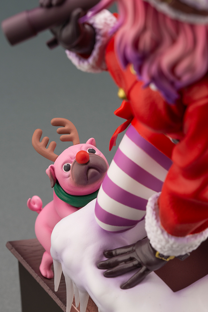 本作的整體造型由原型師「藤本圭紀」操刀、尺寸部分是 21 公分高,高度再現了原畫的各處細節,粉色頭髮的美少女、超短的火辣聖誕裝、讓整體更具獨特風味的護目鏡、只露出一小截的白嫩大腿都有夠讚,而在服裝皺褶、積雪、冰柱、禮物袋......等部分也施以細膩的造型刻畫,就連槍管上的「Merry Christmas」字樣也考究地還原,不過,壽屋把原畫中禮物袋裡的戰車模型改成自家商品的印刷才是最會的吧!