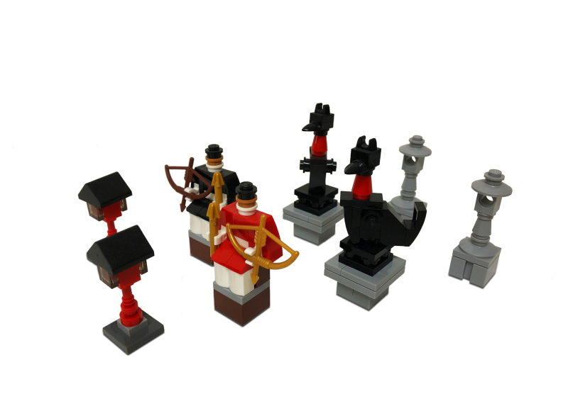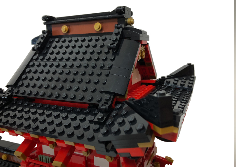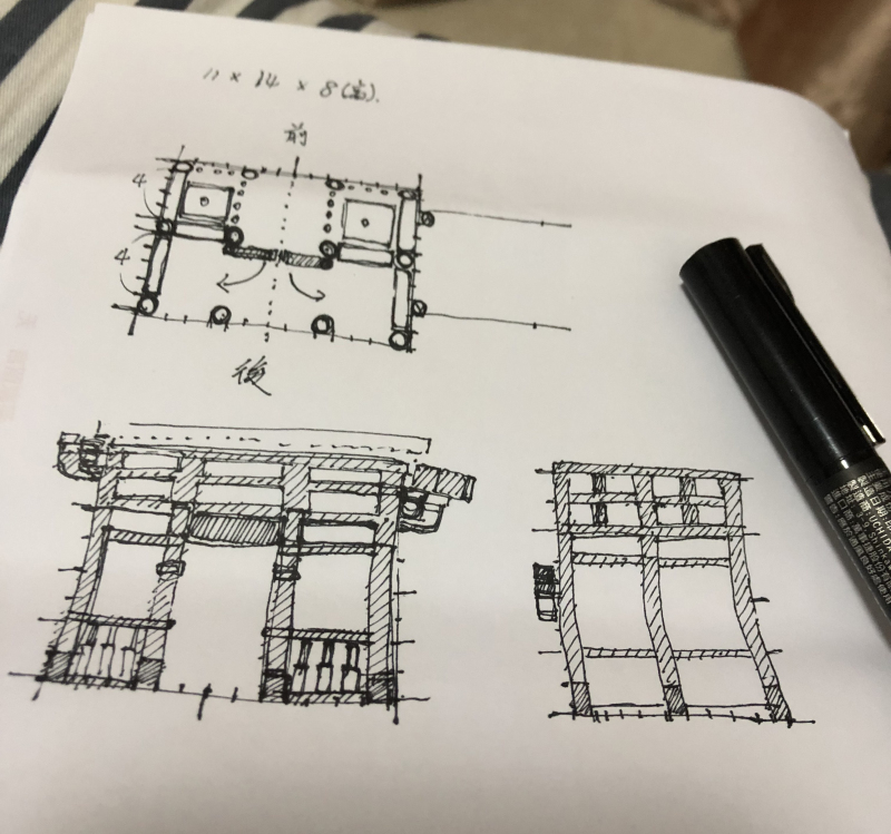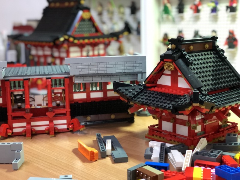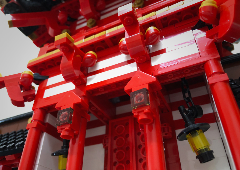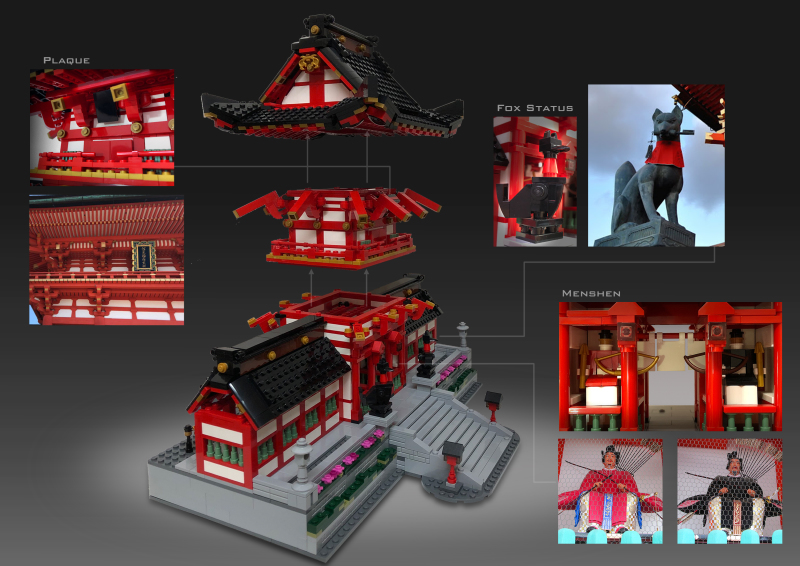 「稻荷大社樓門」從蒐集資料、素材到設計、蒐集零件一共花了2年左右的時間,由於需要大量重複的零件,所以大多數零件都是網拍平台上拆買;整個作品最麻煩的部分在嘗試不同零件,為了要達到想要的效果需要用很多不同的零件去嘗試,由於是業餘小資玩家手邊零件真的不多,每次嘗試就得下一筆訂單,如果效果不好就只能再買其他零件來試,找零件、等包裹上花費非常大量的時間。