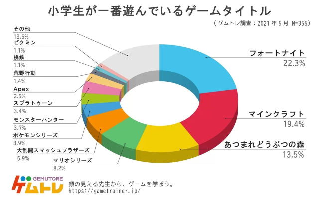 在2021年5月的調查上觀之,多平台《要塞英雄》22.1%連續兩年衛冕成功,《我的世界》17%和《集合啦!動物森友會》14.1%則位居二三名次,其他零碎的任天堂遊戲:《皮克敏》13.5%《明星大亂鬥》5.9%、《寶可夢》3.9%、《馬力歐系列》8.2%、《斯普拉遁系列》1.6%加起來則不容小覷。