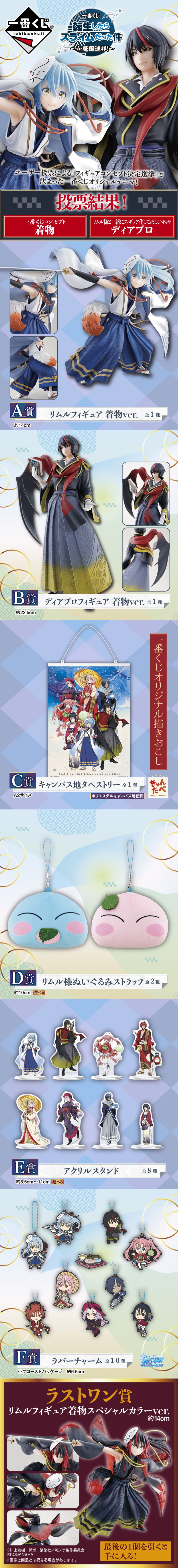 《關於我轉生變成史萊姆這檔事》繼先前推出的「~私立坦派斯特學園!」等一番賞作品後,這次全新的一番賞以「~和魔國連邦!~」為主題,推出六種級別+最後賞的賞品,分別有三款角色模型:A賞「利姆路 和服ver.」、B賞「迪亞布羅 和服ver.」和最後一賞「利姆路 和服特別色ver.」,除了躍動的造型之外,和服的細節紋理也相當細膩!另外還有 C賞「A2 帆布掛報」、D賞「史萊姆絨毛吊飾」、E賞「壓克力展示架」、F賞「橡膠吊飾」等精彩的獎品~