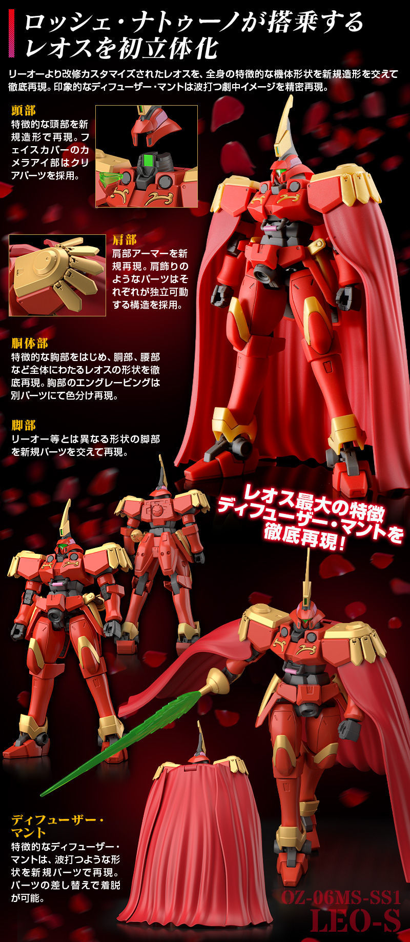 OZ-06MS-SS1 雷歐斯所屬 OZ 普萊斯的星屑三騎士之一羅傑.那多納所駕駛的里歐特裝機,整體性能相比一般里歐更為強化。自尊極高的羅傑是騎士道的信奉者,因此搭載了光束決鬥軍刀、光束滑膛槍等武裝,甚至在背部搭載觀賞性滿點的紅色披風。