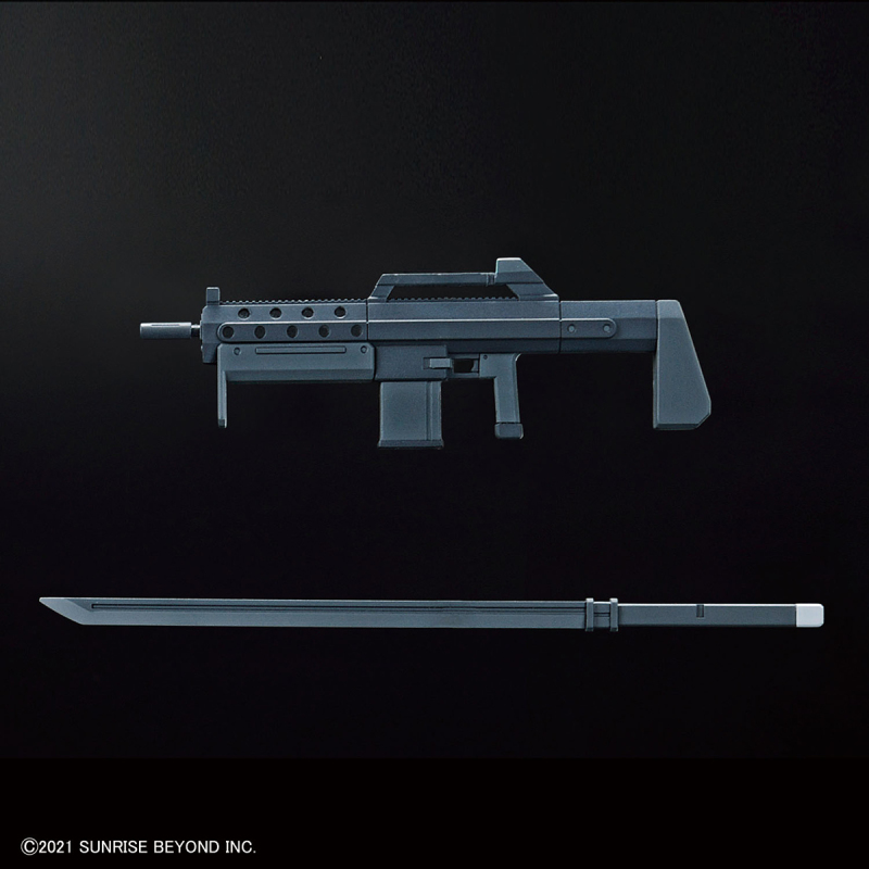 商品內容:60mm攜帶型機砲×1、超熱振動式戰鬥直刀×1、附盾短劍×1、武裝掛架×1、平手替換手掌(左右)、持武器手替換手掌(左右)、持槍手替換手掌(右)、未完成狀態再現用零件一組、補色貼紙×1