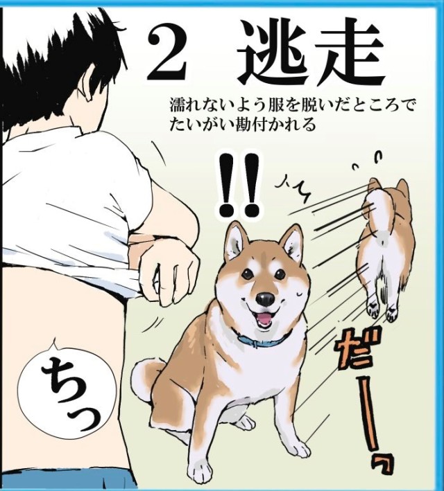 三十六計,走為上策!為了防止幫狗狗洗澡時衣服被潑濕,主人會開始脫掉上衣…這種時候不跑不行啊!