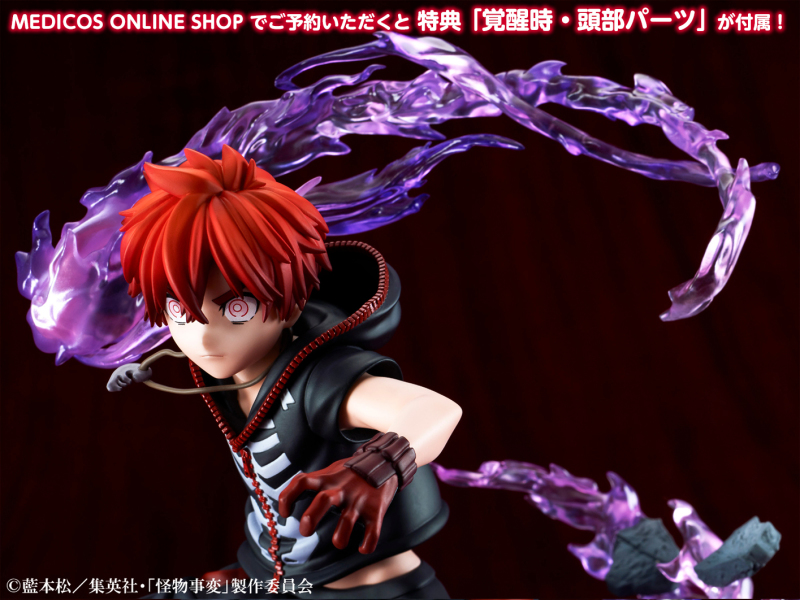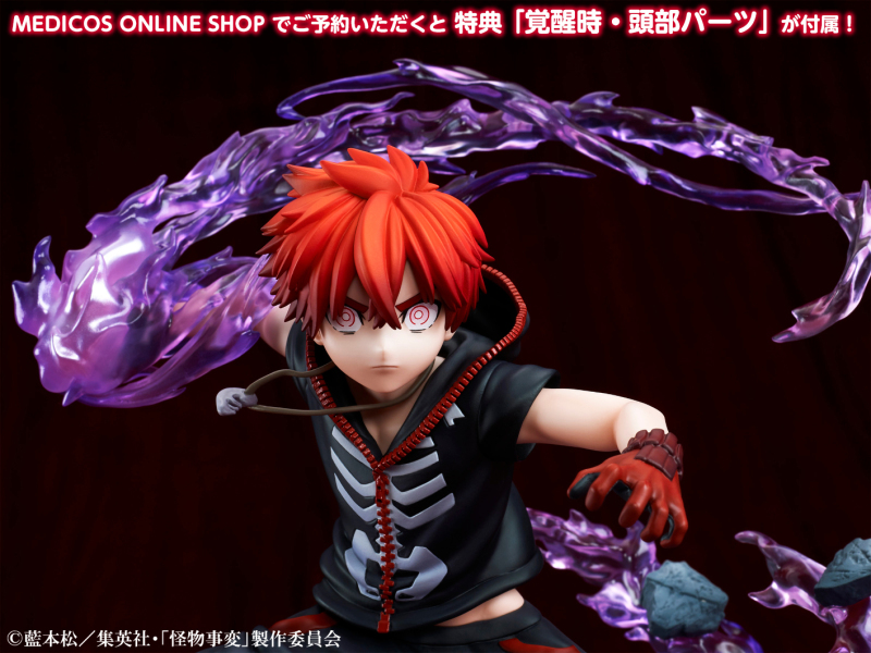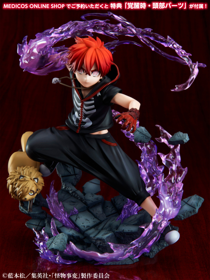 MEDICOS「日下夏羽」1/8 比例模型,將動畫《怪物事變》角色設計、總作畫監督:立花希望 所繪製的插畫立體化!尺寸全高約205mm,還原夏羽的無表情與水亮的紅色圓眼睛、特色的線條眉毛,服裝打扮、手套也詳細重現,包含命結石項鍊、上衣拉鍊等細節;腳踩著碎石底座,噴散的碎石隨著紫色半透明如火焰般的特效件揚起,充滿躍動感!腳邊還站有化身為狸貓的可愛「隱神」,呈現出大迫力的戰鬥場景~