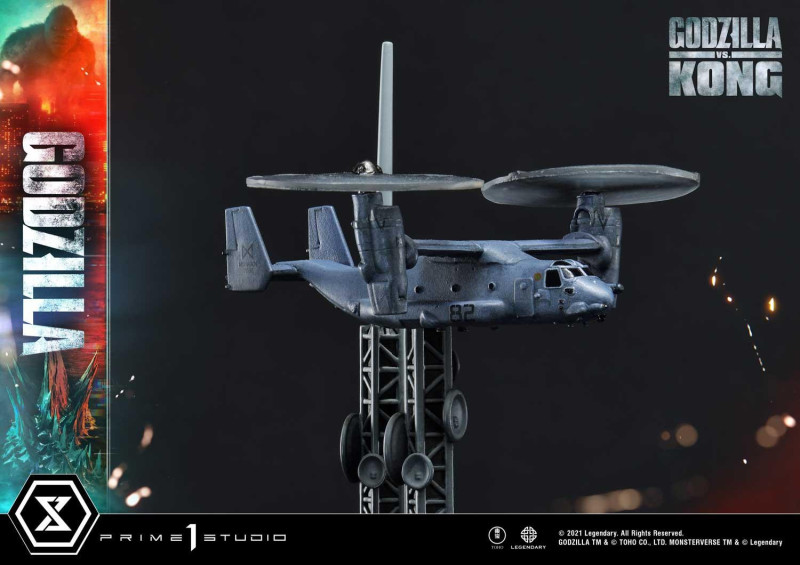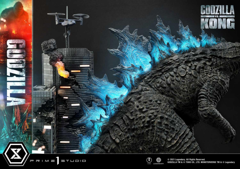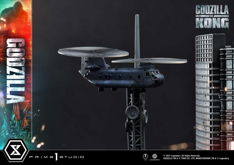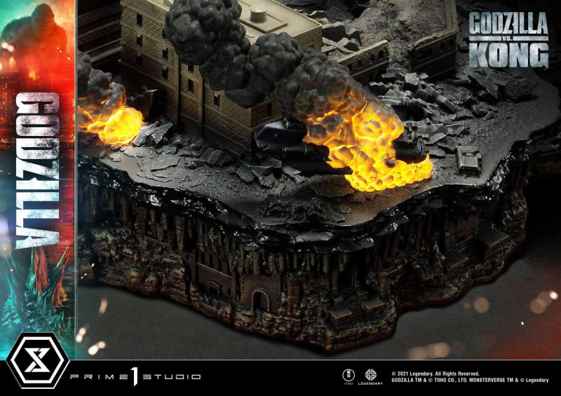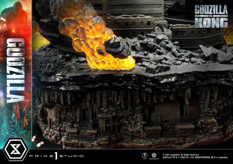 在嘴巴、眼睛與背鰭內藏有LED燈發光機構,發出充滿威脅性的藍光,呈現憤怒的原子吐息!並且亮燈的順序會依序由尾巴末端慢慢亮起,循序到頭部,增添生動的逼迫與緊張感~而令人印象深刻的香港夜景也細膩刻劃,被炸毀、殘破的大樓正揚起火光與煙霧,在多處內置有LED燈,營造出火勢在各處肆虐的場景,直升機在混亂中無助地在四周環繞...另外,除了驚人細節的底座,在建築之中還暗藏有 prime 1 studio 的大樓?等著玩具人買回家細細欣賞與挖掘更多細節!