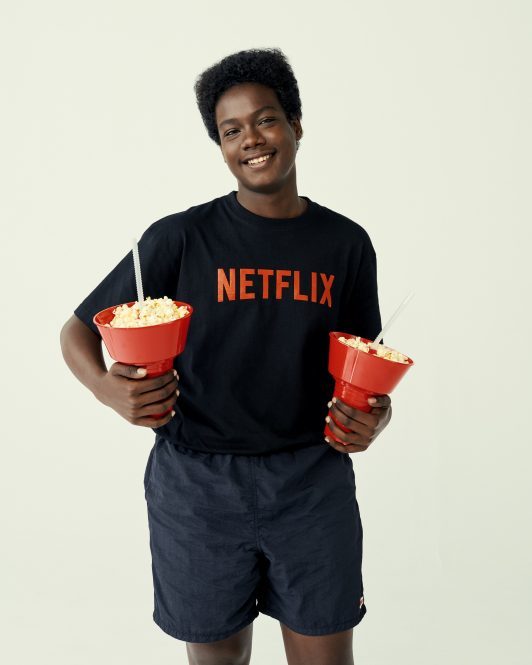 除了鑲有大大的Netflix LOGO的T恤、帽子、領巾…等服飾外,甚至連能夠放在沙發或是床鋪上的抱枕,也都屬於本次合作的其中之一商品。當然為了能夠體驗宛如在戲院裡觀影的感受,官方也特別推出飲料架,左右各一個飲料孔,你可以一邊放著可樂、另一邊放著用紙杯裝著的爆米花或是洋芋片都不成問題。