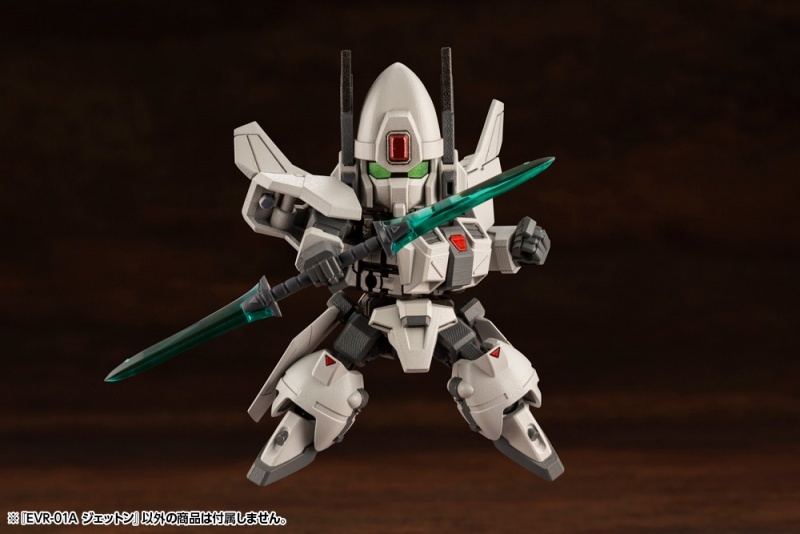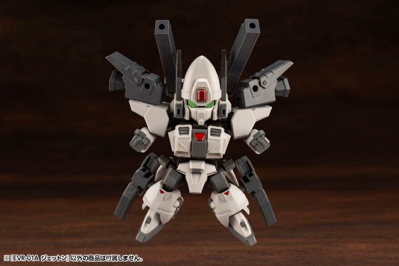 「EVOROIDS EVR-01A JET-N」套件使用米白、灰色、槍鐵、透明綠四色成形,機體核心部份由多數設計簡單且實用的 3mm 規格連結零件組成,加裝上裝甲後即可輕鬆完成,並能從機器人型態完全變形為戰機型態。