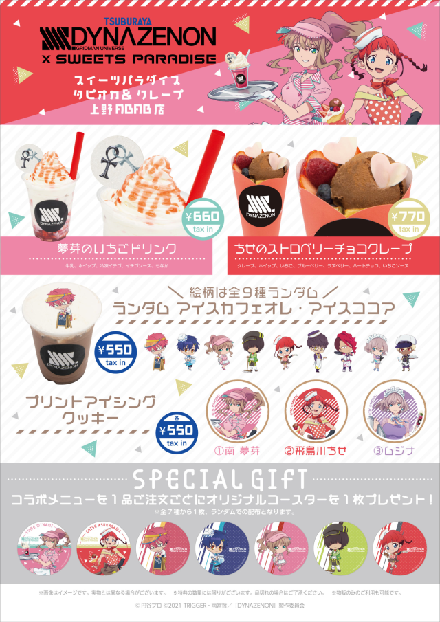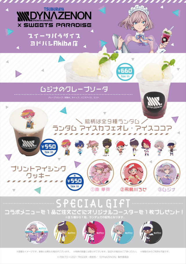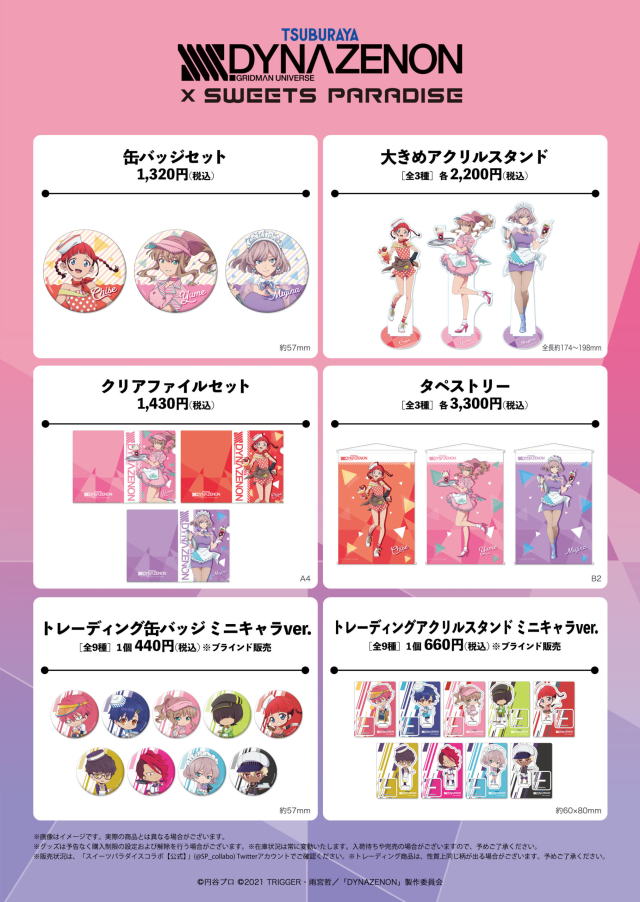 最近上映的新番動畫《SSSS.DYNAZENON》,近日宣布將與日本連鎖的甜點吃到飽餐廳 「SWEETS PARADISE」合作,推出期間限定的聯名餐點,並販售原創的周邊商品,角色姆吉娜、南夢芽與飛鳥川千瀨也穿上服務生的服裝做為視覺圖。活動將於 2021 年 6 月 4 日〜 6 月 30 日展開,於友都八喜秋葉原店&上野 ABBA 店限定販售。