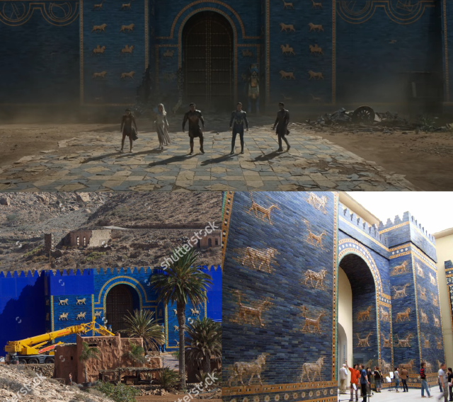 預告中不少壯麗的外景畫面,其實都是實景拍攝,而這座巴比倫王朝的「伊什塔爾城門」,也是在導演趙婷的堅持下一磚一瓦搭建而成。左下圖為本片片場搭建時的側拍;右則為德國帕加馬博物館重建品。