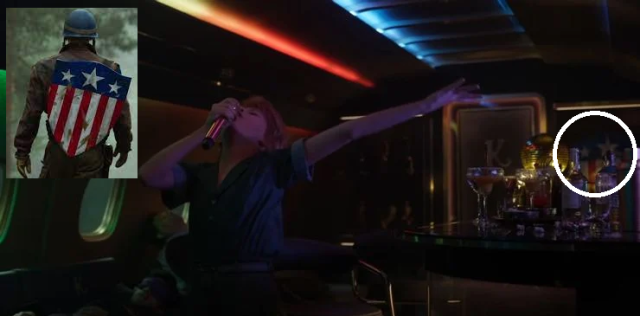預告有一幕水精靈在飛機上唱卡啦OK的場景,從門上的K字可以推測應該是身為寶萊塢巨星金格 (Kingo) 的私人飛機。另外,畫面右邊則懸掛著美國隊長初次登場使用的盾牌,但畢竟原始盾牌已經戰損,所以這可能只是複製品或蒐藏品。