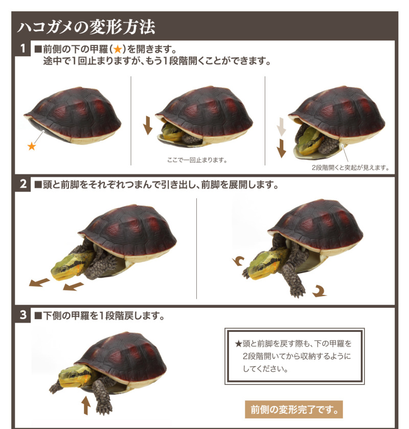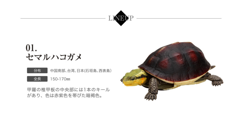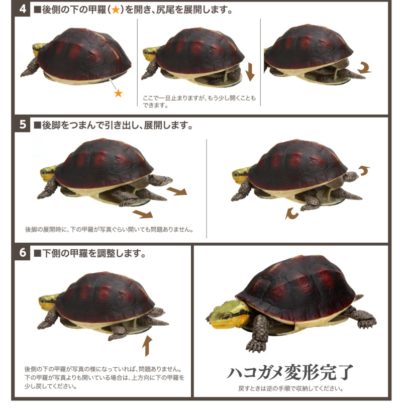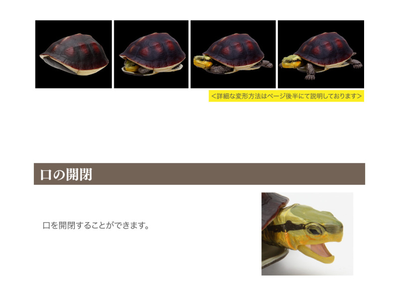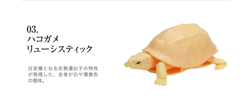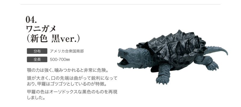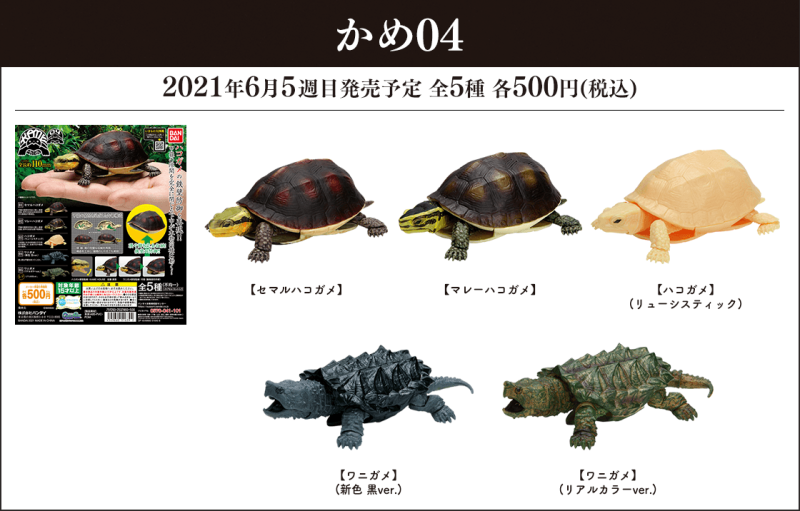 第四彈「烏龜04」轉蛋,推出與前三彈不同造型的食蛇龜、馬來閉殼龜、白化閉殼龜(箱龜),由kame house佐藤真啟擔任原型監修,除了再現頭部的特徵、鷹鈎嘴及特色的背甲顏色、紋路,更以可動設計還原黑色腹甲中間的條橫向韌帶,讓腹甲的前後兩半可以分別向上移動,與前後的背甲閉合,呈現完全密閉、絕對防禦的造型!另外還有由動物造形師守亜氏監督的鱷龜(新色 黑ver.)、鱷龜(真彩 ver.)。