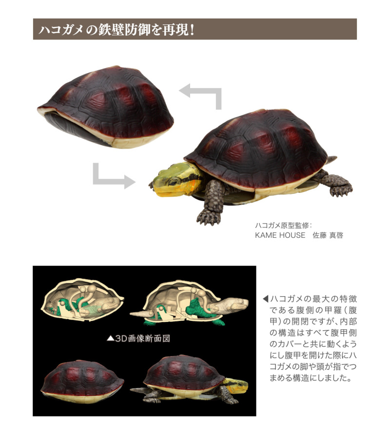 「GASHAPON 烏龜系列」以無蛋殼的環保轉蛋為設計,尺寸不受轉蛋殼規格拘束,轉出來直接就是一顆龜殼。整體擁有具分量的10公分尺寸,將烏龜的外觀逼真還原,並徹底再現烏龜的骨骼構造,設計出可以讓烏龜四肢與頭部都縮回殼中的可動機關!