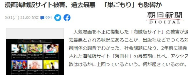 日本「盜版對策委員會J(Authorized Books of Japan,縮寫ABJ)」表示日本盜版漫畫正在史無前例的嚴重惡化中,甚至超過當年《漫畫村》所損失的影響,此狀況或與居家防疫相關,導致目前已知的750個網站持續猖狂,前十名網站的流量超過2億4千萬次數。