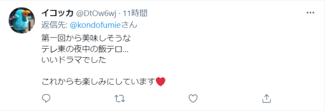 除了帥氣的主廚之外,也有治癒人心的料理。但是這樣充滿美食的連續劇在晚上11點播出實在是有點考驗觀眾的自制力。就有觀眾發表感言說:「在這種時間播出根本是宵夜恐怖份子,肚子好餓」、「要看千萬要小心!」