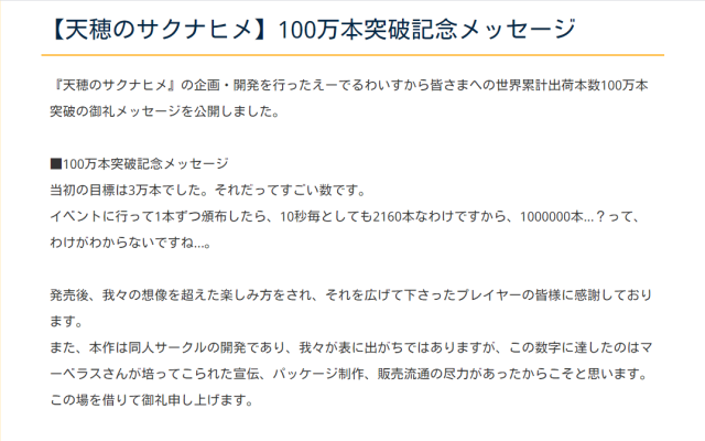 聽到這個好消息,負責企劃、開發《天穗之咲稻姬》的團隊「Edelweiss(えーでるわいす)」向玩家們發表了達成這項成就的感言。他們在開頭表示,其實當初設立的目標只有3萬,而且對獨立遊戲工作室來說,3萬其實就算是很大的數字了。所以今天看到100萬這個數字,他們是驚訝到都不知道該怎麼反應過來。Edelweiss說:「我們很感謝在發售後用超越我們想像的方式在享受這個遊戲,並為我們宣傳這個遊戲的各位玩家。」