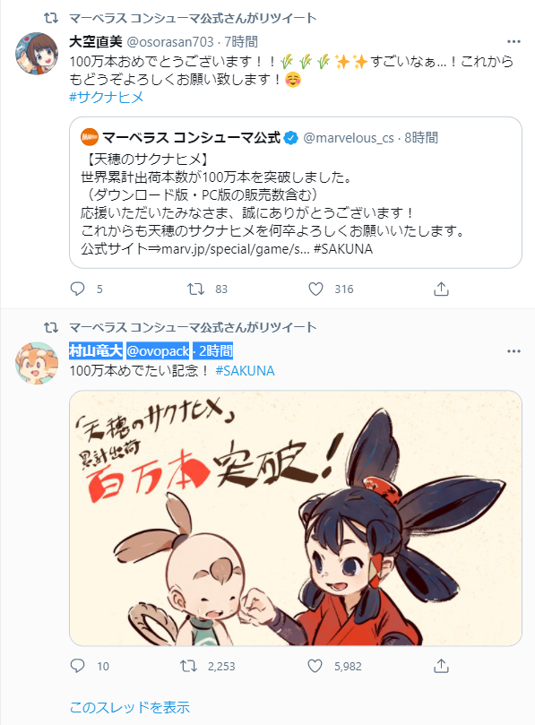 除了玩家,他們也感謝Marvelous。雖然只要提到《天穗之咲稻姬》很多人就會提到Edelweiss,但今天這樣的獨立作品能夠達到這樣的成績,都多虧了Marvelous盡力盡力為他們宣傳、包裝製作和販賣。他們在感言最後致謝:「我們想藉這個場合致謝!」