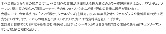 目前公布的資訊,將會展示大量的複製原畫手稿,並將會有鏈鋸人雕像展出;展場內還會把劇中早川秋家裡的一部分的角落重現,讓入場的粉絲能夠拍攝參觀,讓大家能夠沉浸在鏈鋸人的世界觀。