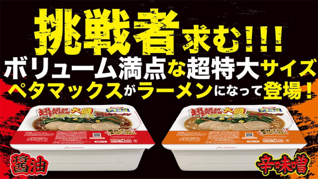 先前報導過的日本品牌ペヤング的「Peyoung超超超超超超巨量日式炒麵泡麵 PetaMax」成功引起話題,日本有為數不少的網友挑戰,這次ペヤング又來了,將推出「Peyoung超超超超超超巨量拉麵 PetaMax」醬油&辣味噌口味,招募挑戰者嘗試吃下這一般款式的 7.3 倍大的巨大化食物。