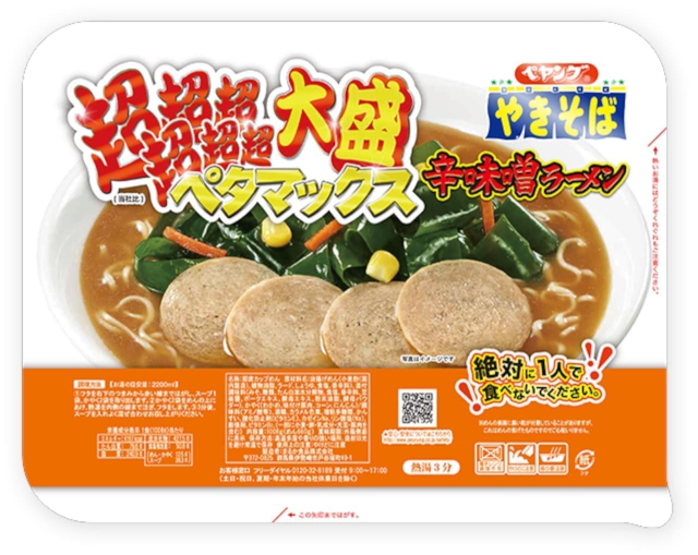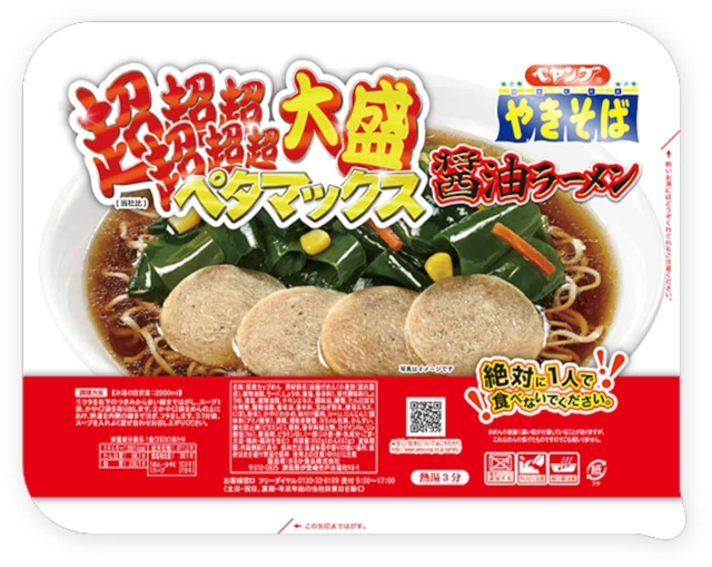 直接在包裝寫上「請絕對不要一個人吃!」 的「Peyoung超超超超超超巨量拉麵 PetaMax 」是ペヤング史上最大量級的商品,不但有著一般炒麵的 7.3 倍,泡這碗麵更要 2200 ml 的水。