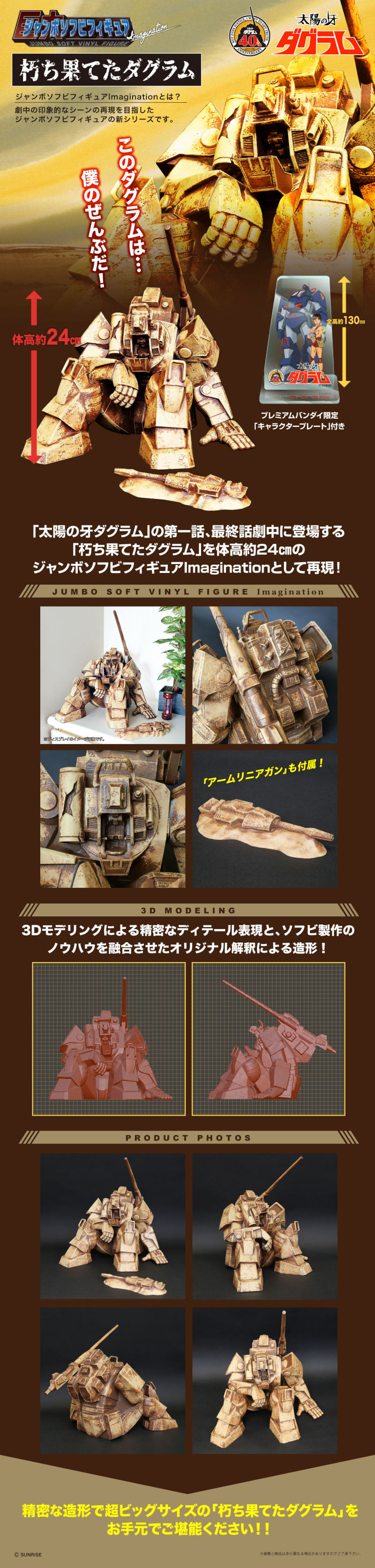 JUMBO SOFT VINYL FIGURE Imagination「腐朽的達格拉姆」軟膠模型,尺寸全高約 24 公分,將動畫第一話與最終話中,已死的鐵甲戰士達格拉姆經典場景立體化。充分利用最新的數位建模技術,融合了軟膠獨有的製作方法與射出成型零件,創造出逼真的存在感。塗裝方面也以費時的銹蝕風化上色,呈現出達格拉姆歷經風霜—鋼鐵的臂膀枯萎、鋼鐵的雙腳無力,損壞的大砲不再能噴出火焰,在沙海中荒廢腐朽模樣忠實再現。