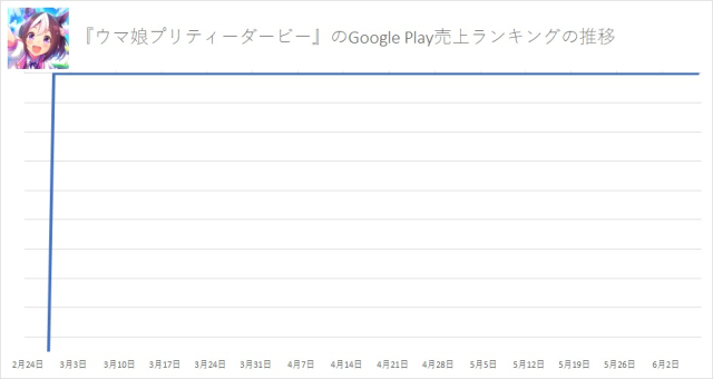 根據日本 Google Play 商店的數據顯示,手機遊戲《賽馬娘 Pretty Derby》 自從在 2 月 28 日後 ( 2/24 開始營運 ),在玩家課金榜上攀上首位後,直至統計數據完結日 ( 6/6 ) 就再也沒有讓出寶座過,累積一百天的霸榜成績,幾乎是前所未見的可怕里程碑。