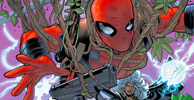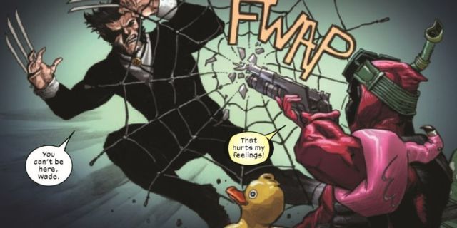 正當X特攻隊擔當起這場慶典的保全工作時,死侍就這麼偷偷地從海岸上冒了出來XD;當然,他馬上被金鋼狼抓了個正著,還被迫打了一架。幸好多米諾(Domino)及時用她的好運能力前來救場,然後狠狠放火燒了死侍一頓。但可別說他們下手太重,因為死侍幾乎打不死,而且金鋼狼真的試過了口頭勸阻!