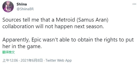 經常報導《要塞英雄 》消息的推主@Shiina在今日(8)表示「Epic已經努力爭取了,但還是沒辦法從任天堂手裡獲得授權」--表示《銀河戰士》的女主角「莎姆斯·艾倫 Zero」不會出現在《要塞英雄 》中—至少在下個賽季無望。
