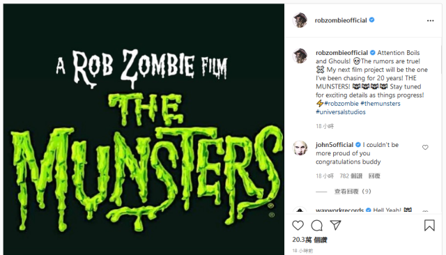 重金屬搖滾歌手暨多方面藝人羅伯殭屍(Rob Zombie)在今天證實了自己即將要執導傳聞久的1960年代奇幻喜劇影集《怪胎一族》(The Munsters)的重啟版電影!