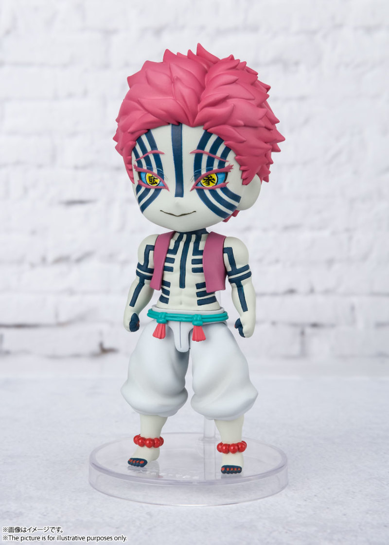 「Figuarts mini 猗窩座」,將十二鬼月中的上弦之叄,鬥之鬼以可愛的比例立體化。還原桃紅色短髮、金色瞳眸以及詭異的膚色等特徵,全身刻滿無數代表罪人的深藍色刺青,指甲血紅、腳腕上的念珠等細節也仔細還原。附有替換手勢,可以再現血鬼術術式展開的等精彩的劇中動作!