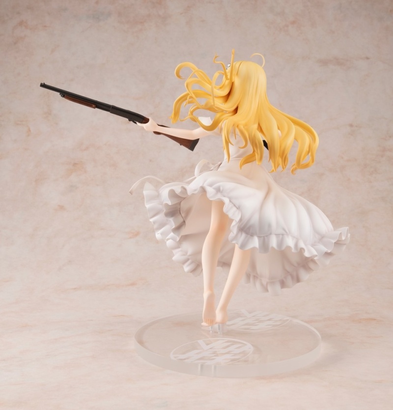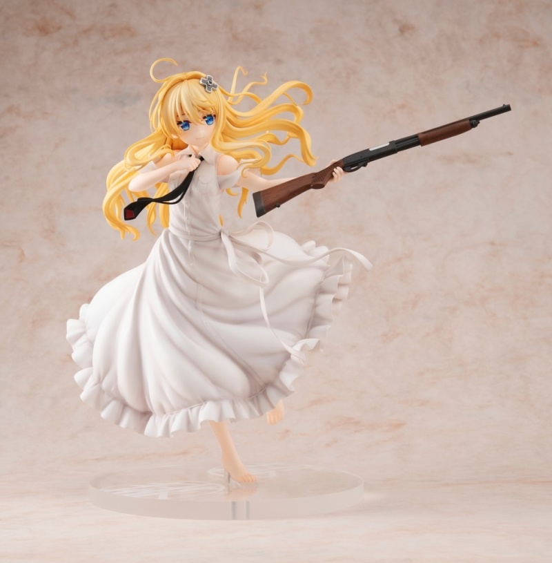 「如月愛麗絲 原作版」1/7比例模型,以刊登於 2018 年出版「The Sneaker LEGEND」的 Kakao Rantan 插畫為原圖製作,尺寸全高 21 公分,掂起腳尖的單腳暫姿,讓一身潔白的連身裙生動飄逸,特徵的金髮也自然揚起;細膩的領帶、荷葉邊裙擺以及腰間的緞帶等,增添整體動態感。外觀看起來是 10 多歲的少女,手裡卻拿著愛用的 M1912 散彈槍,在 Kakao Rantan 的監修之下,更是還原了淡淡的溫柔笑容以及可替換的好勝表情!