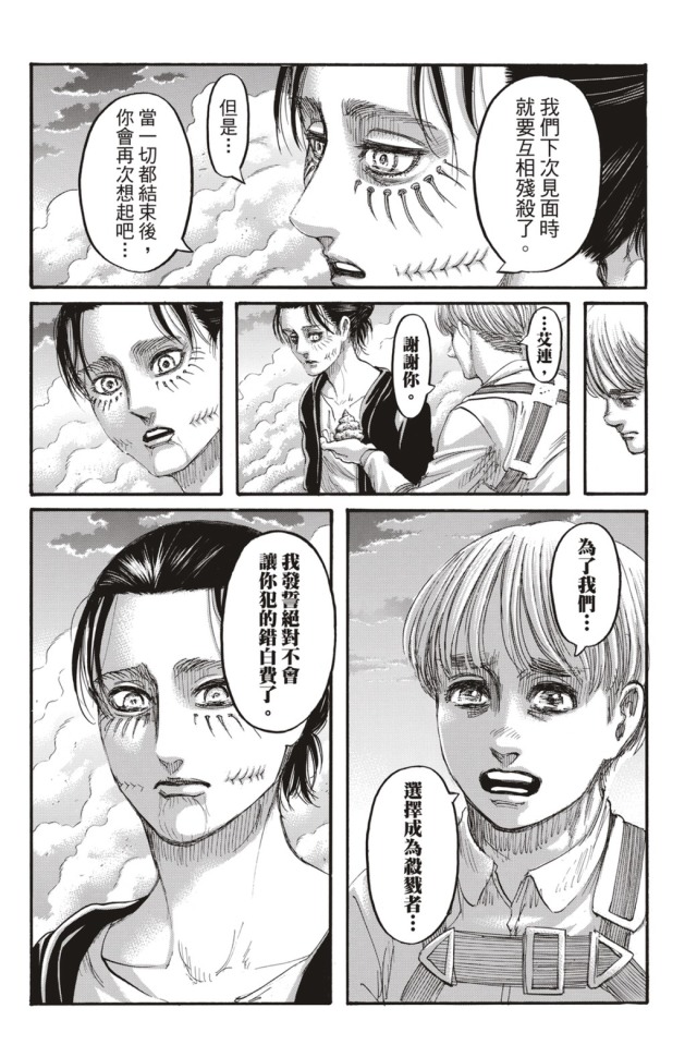 不過在《進擊的巨人》最終話中,在艾連與阿爾敏之間的談話與最後走向,不僅讓讀者改變了對這部作品的評價,更使得讀者之間陷入兩極化的評論,而這也是為什麼後來諫山創老師決定在單行本中追加頁數,來將其合理化。